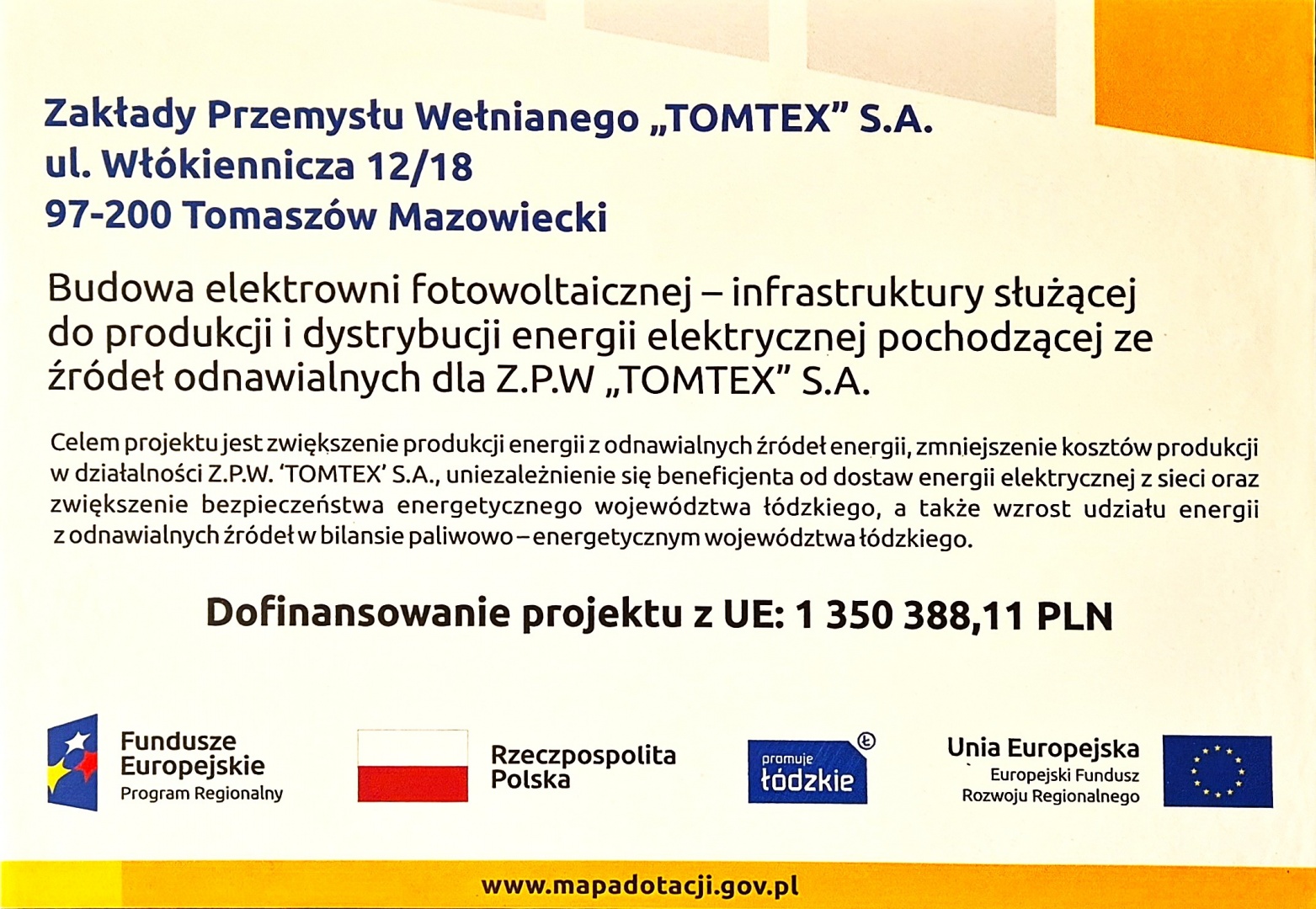 Zakłady Przemysłu Wełnianego „TOMTEX” S.A. z Tomaszowa Mazowieckiego zrealizowały projekt budowy elektrowni fotowoltaicznej służącej do produkcji i dystrybucji energii elektrycznej ze źródeł odnawialnych dla potrzeb zakładu.